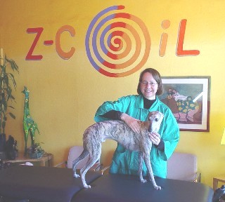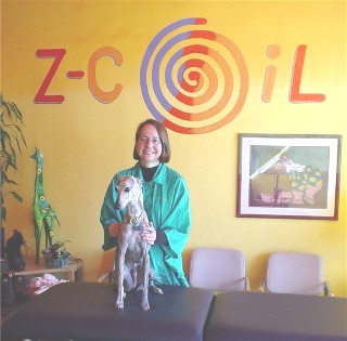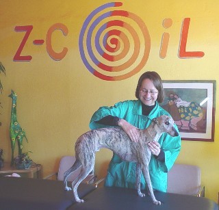 Margaret could not practice canine massage without her Z-Coil shoes, which have eliminated her knee pain while standing. She also wears them whenever she walks her dog and no longer suffers from the sore legs and shin splints that she used to experience. See below for pictures of Loki and Margaret wearing her Z-Coil shoes while doing canine massage at the Footopia store in Denver: